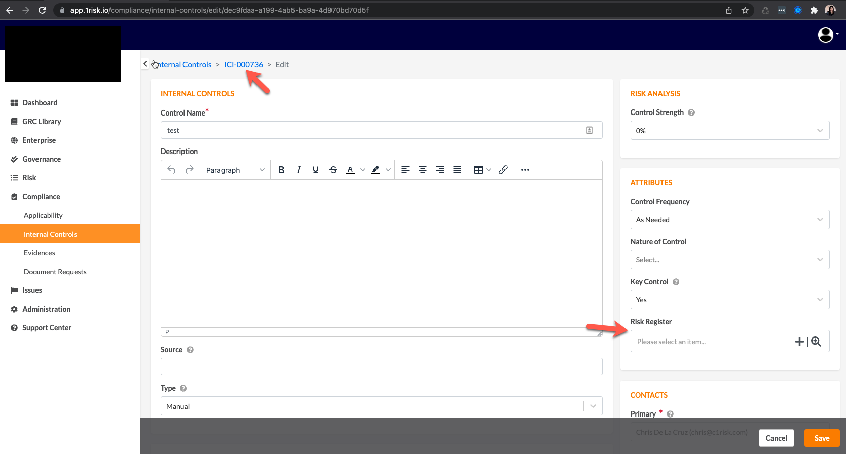 3. On the Risk Register field, you can add a new risk register or lookup an existing risk register.