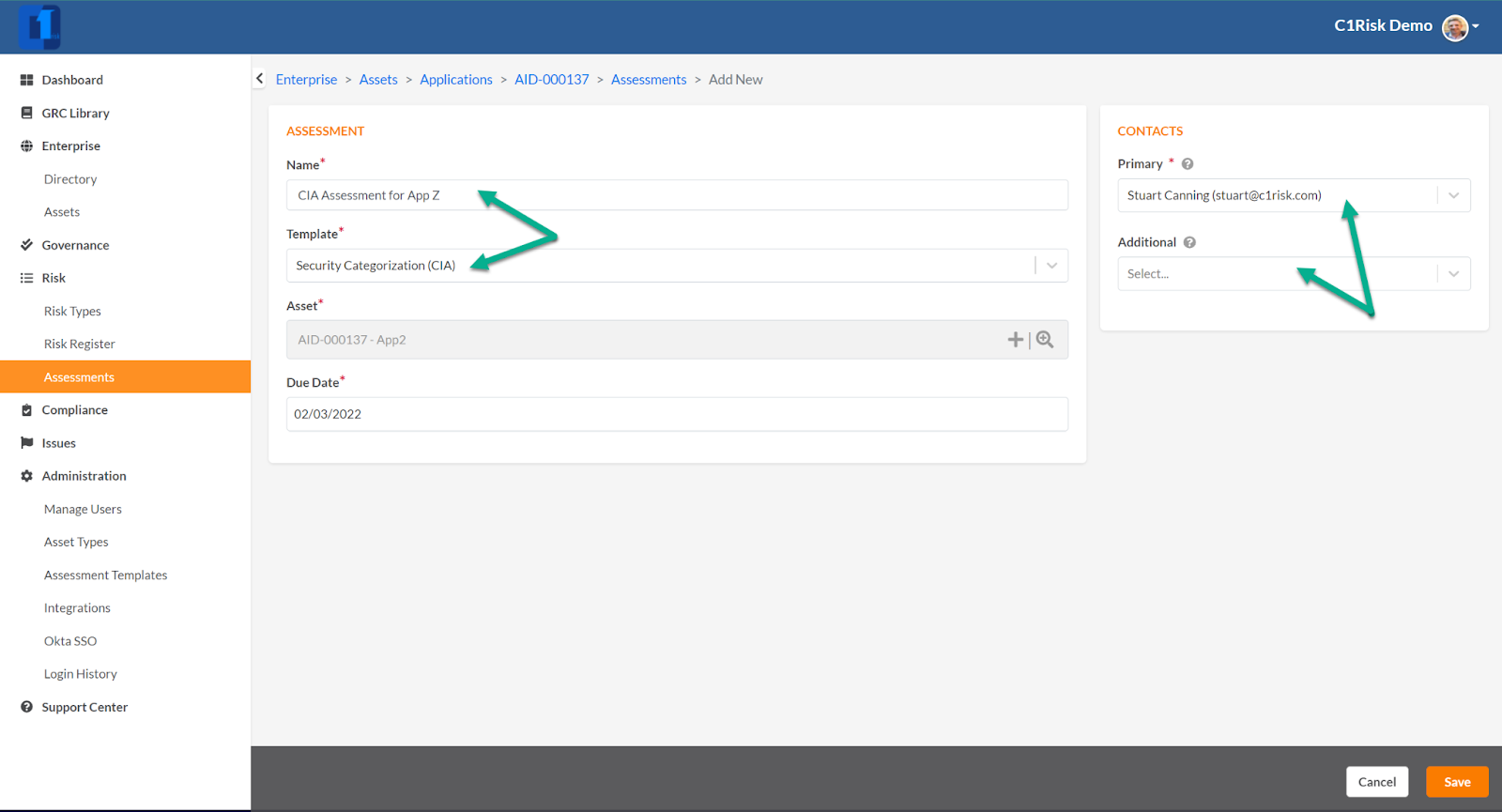 Note you can either send this assessment to the Asset Owner (recommended), temporarily assign yourself as the asset owner, or to complete the assessment but also notify the Asset Owner, you can assign yourself as an Additional Contact.