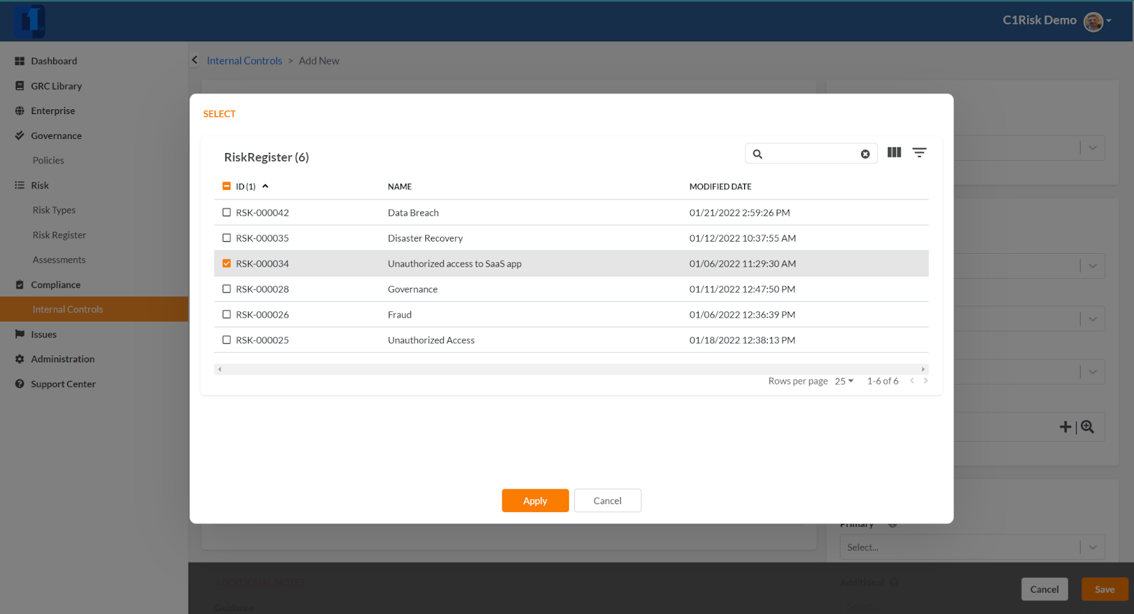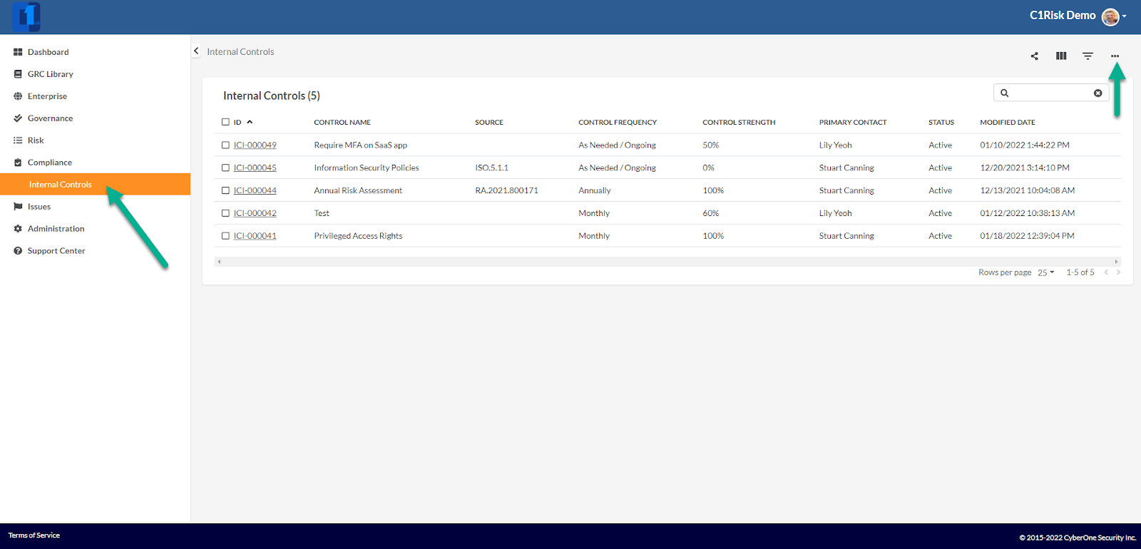 - Go to the Compliance Section in your 1Risk Register and select the Internal Controls view.