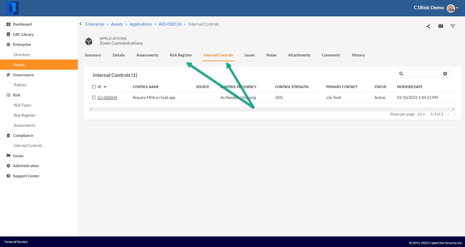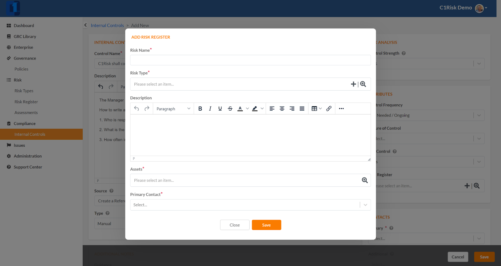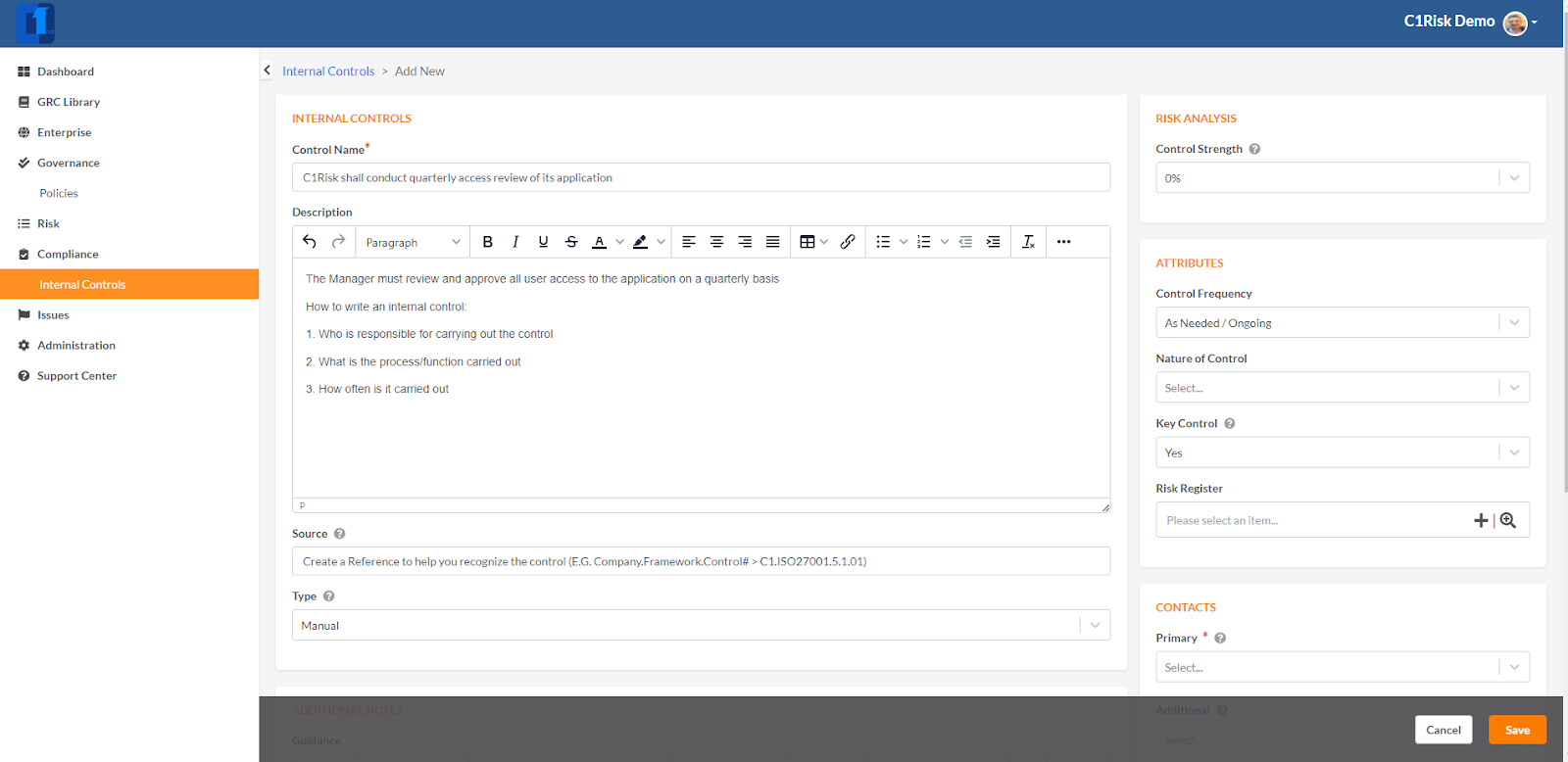 - Primary Contact: The Control Owner (must also be a registered contact on C1Risk