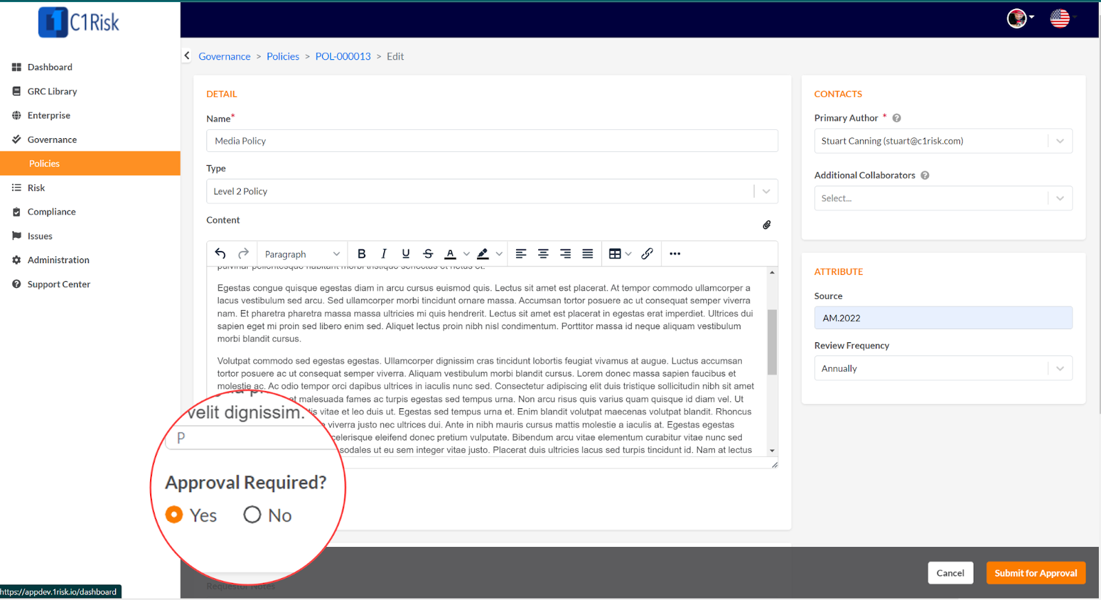 - Click Submit for Approval and reviewers will be notified via email that the policy/document is ready for review
