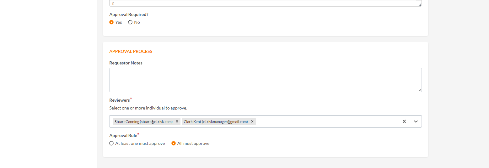 When a document is created, attached or linked in the 1Risk platform, the record provides you with the option to set up an Approval or Review process.