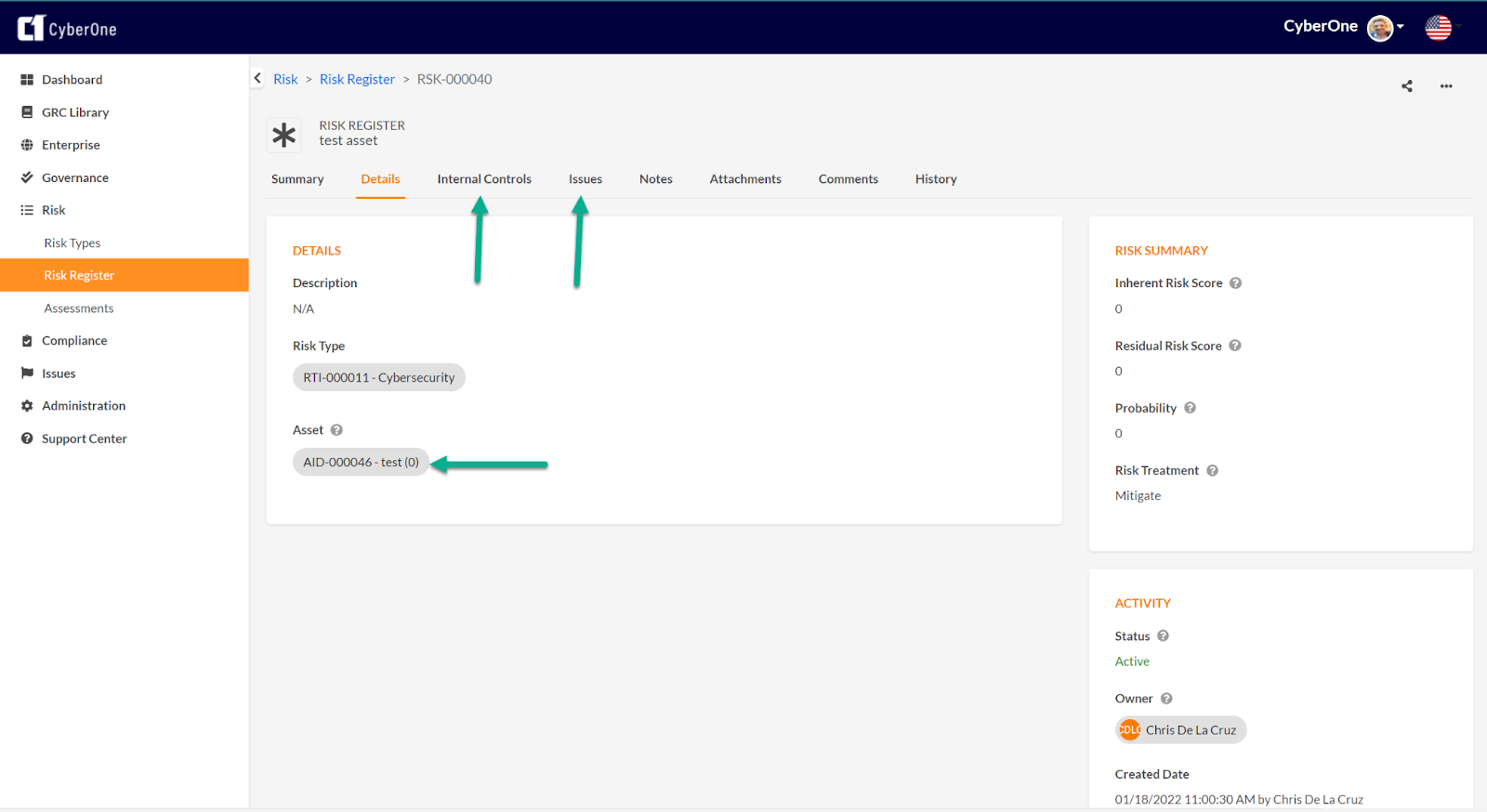 Internal Controls can be mapped from the Risk Register record or vice-versa. Simply go to the Internal Controls Section in the Risk Register Record and select ‘Add New’ or ‘Lookup’.