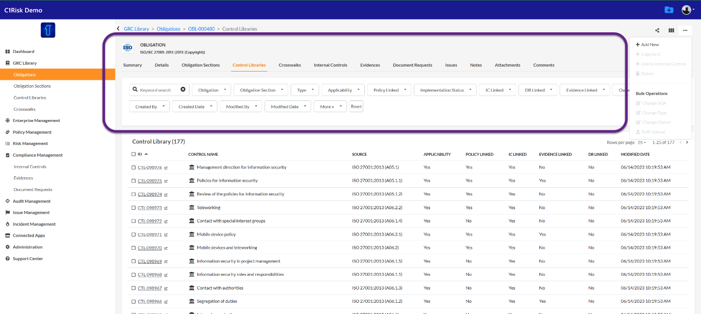 - You can download more than 100 obligations from our central GRC Library. If you don’t see the obligation that you are looking for in our central GRC library, please reach out to C1Risk and our support team will upload it for you. Our standard SLA for uploading new obligations is 7 business days.