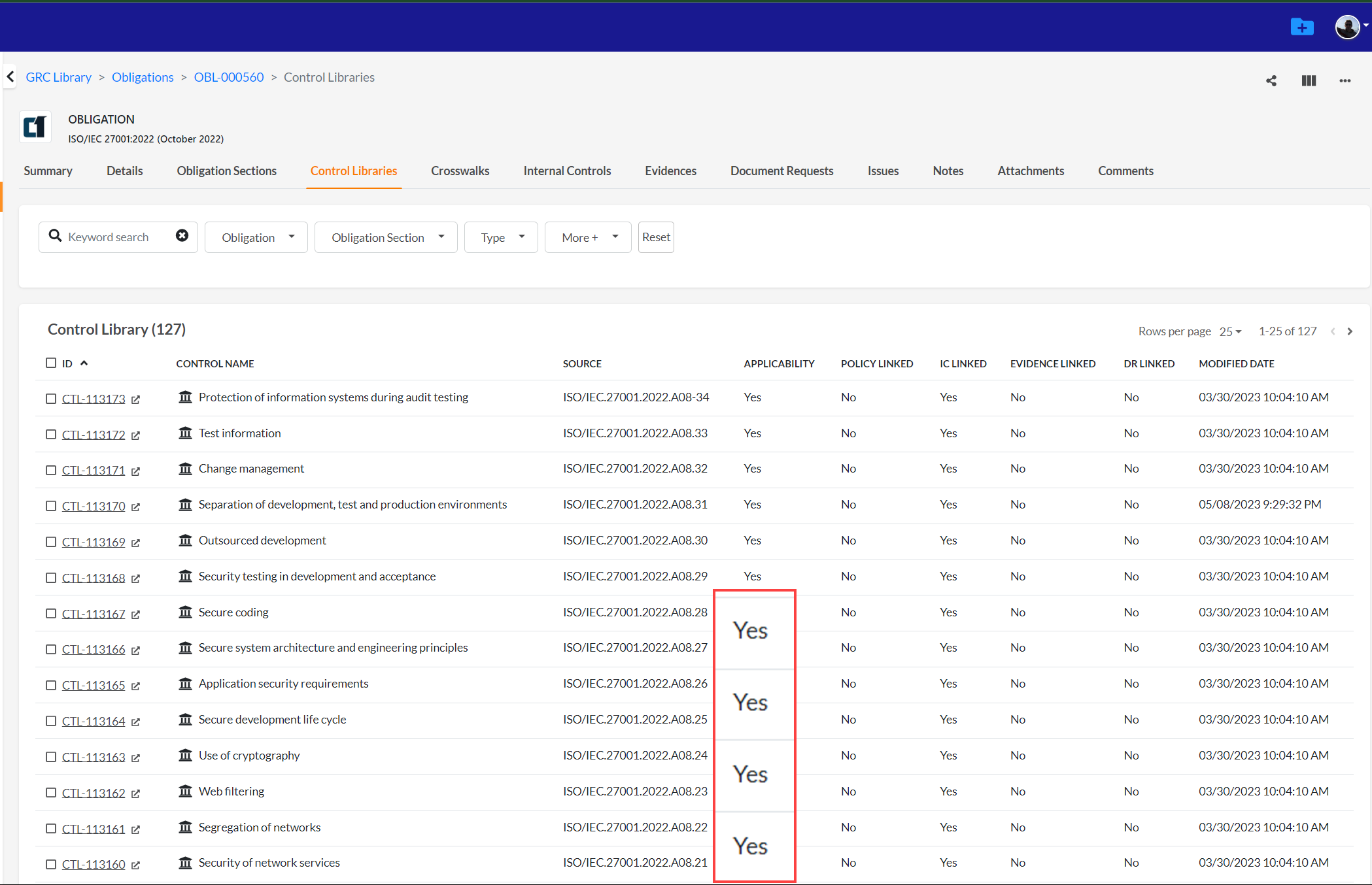 You can apply the SOA filter in the Control Library section to filter and work on only controls ‘in scope’ or review and verify controls ‘not in scope’ for audit.