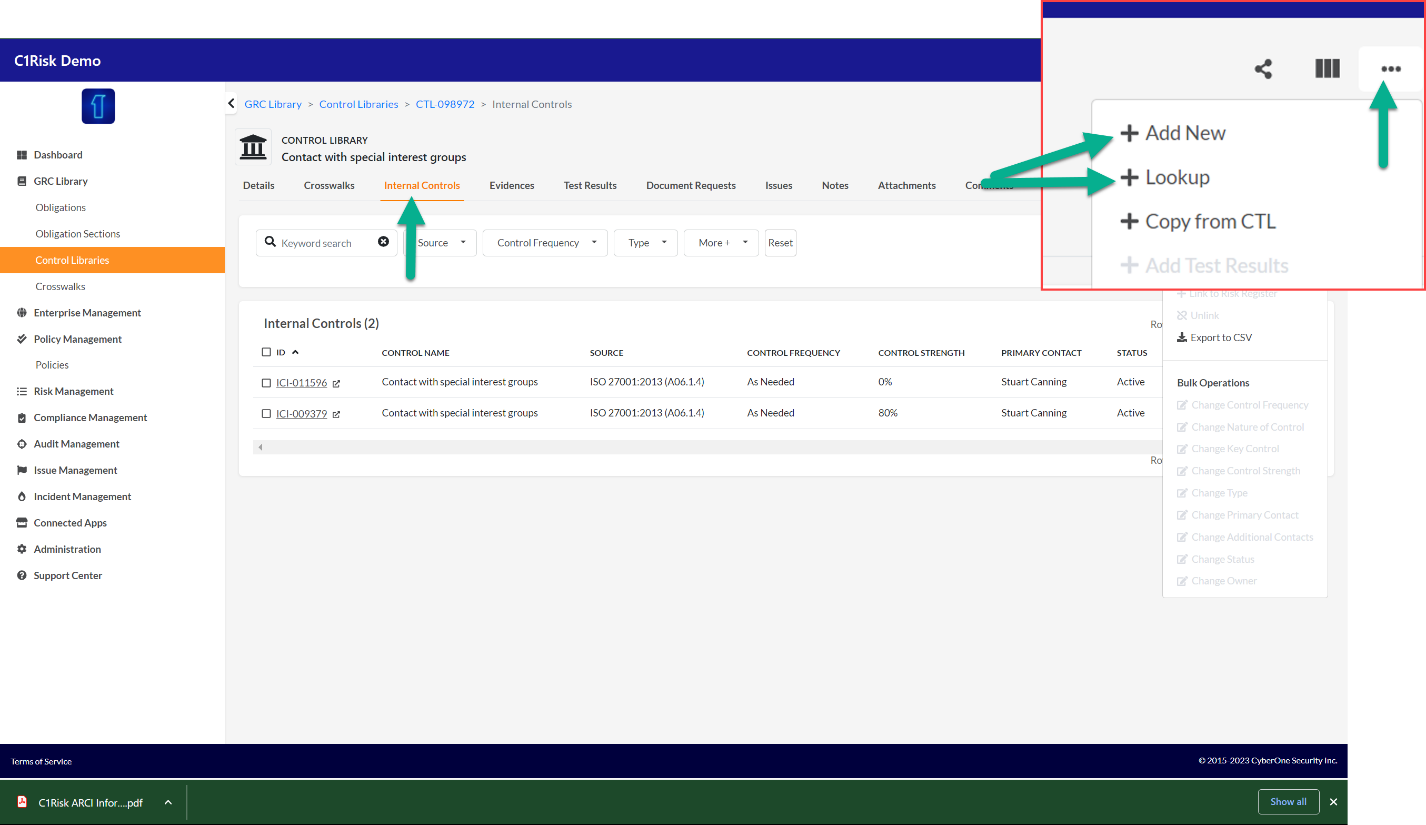 2. In the Internal Controls Tab, use the Ellipses drop-down menu and select Look Up to access your existing Internal Controls or Add New to add a new Internal Control. New Internal Controls will automatically be added to your Policy and the Internal Controls Library in your Compliance module.