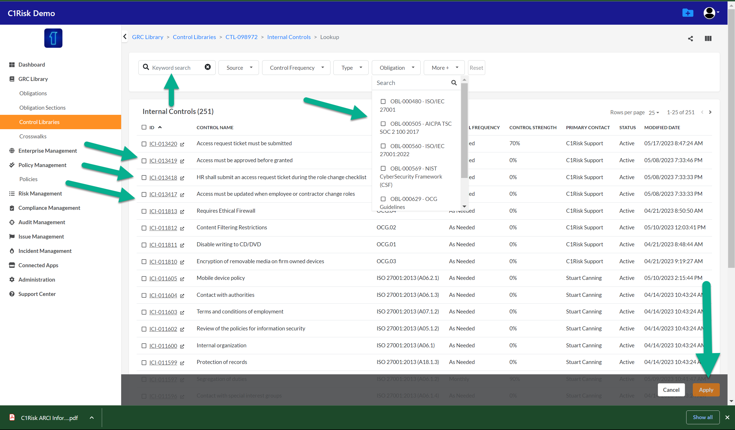 3. Your Internal Control Library will appear. Use the filters and keyword search to select the requirement(s) (obligation) and internal controls you wish to map.