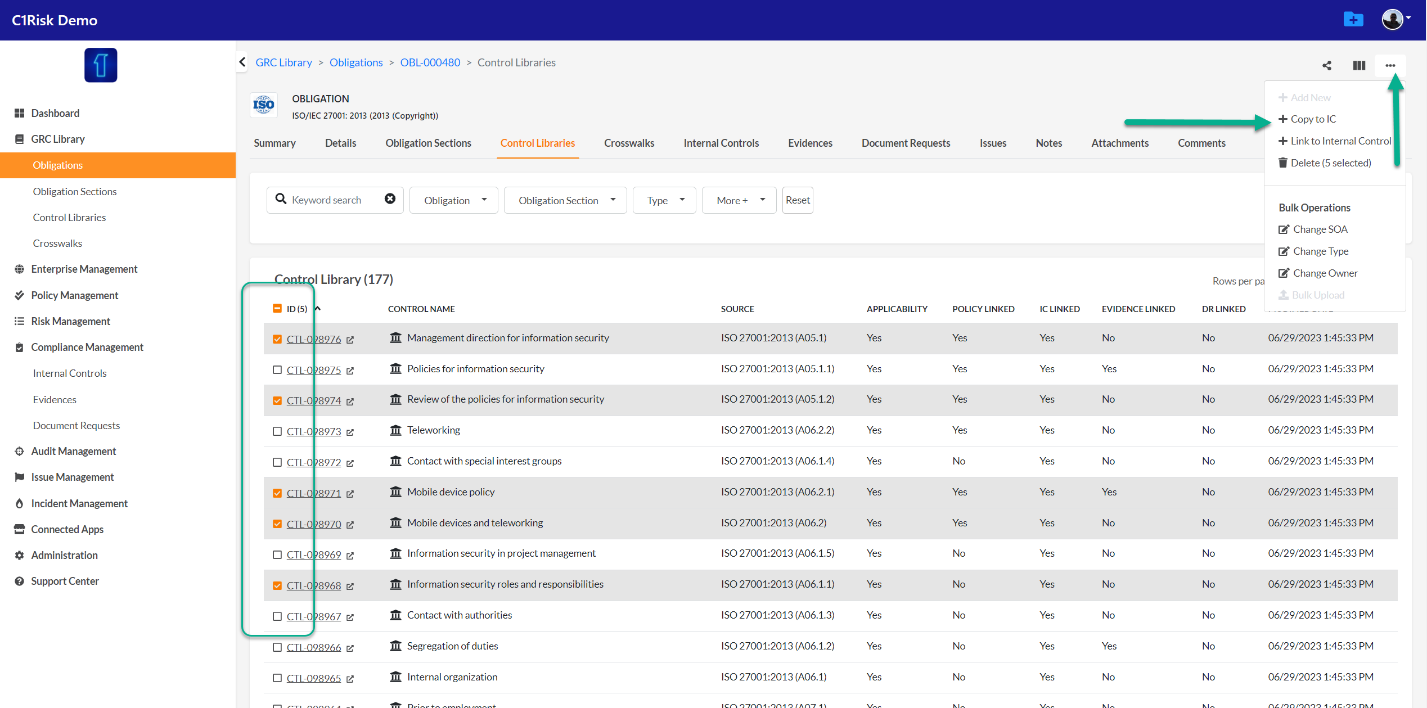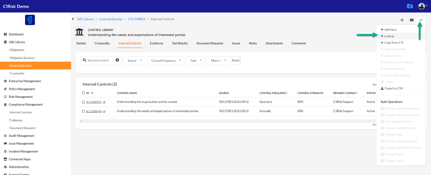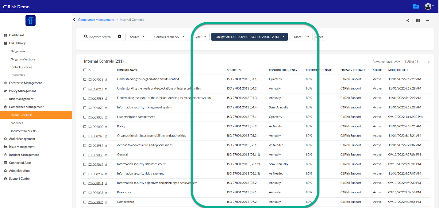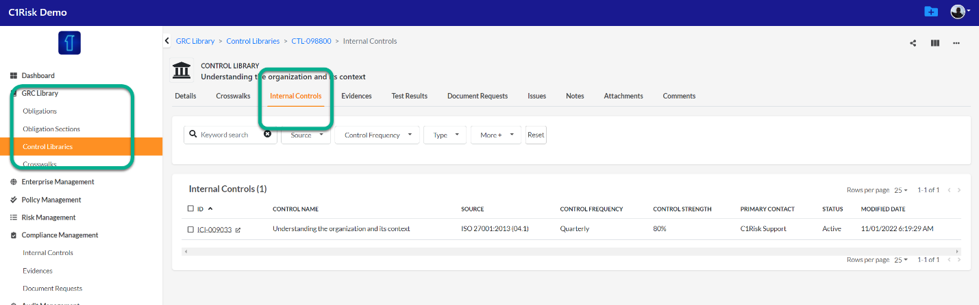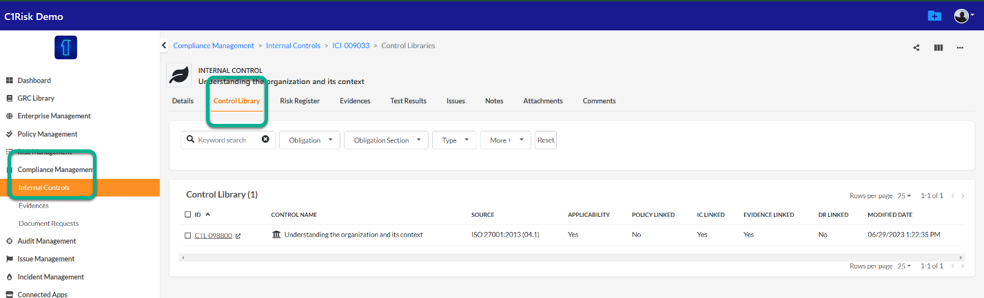 - C1Risk recommends using the tabs in the Obligation record to see which internal controls are linked to the relevant requirement.