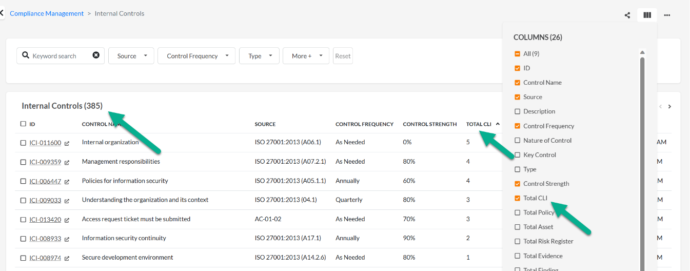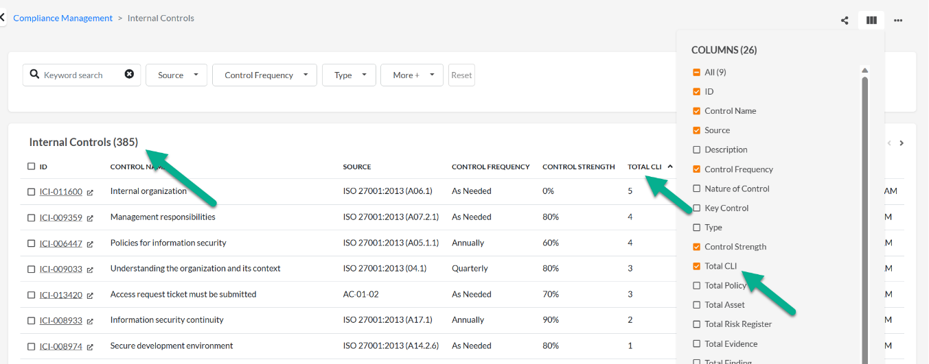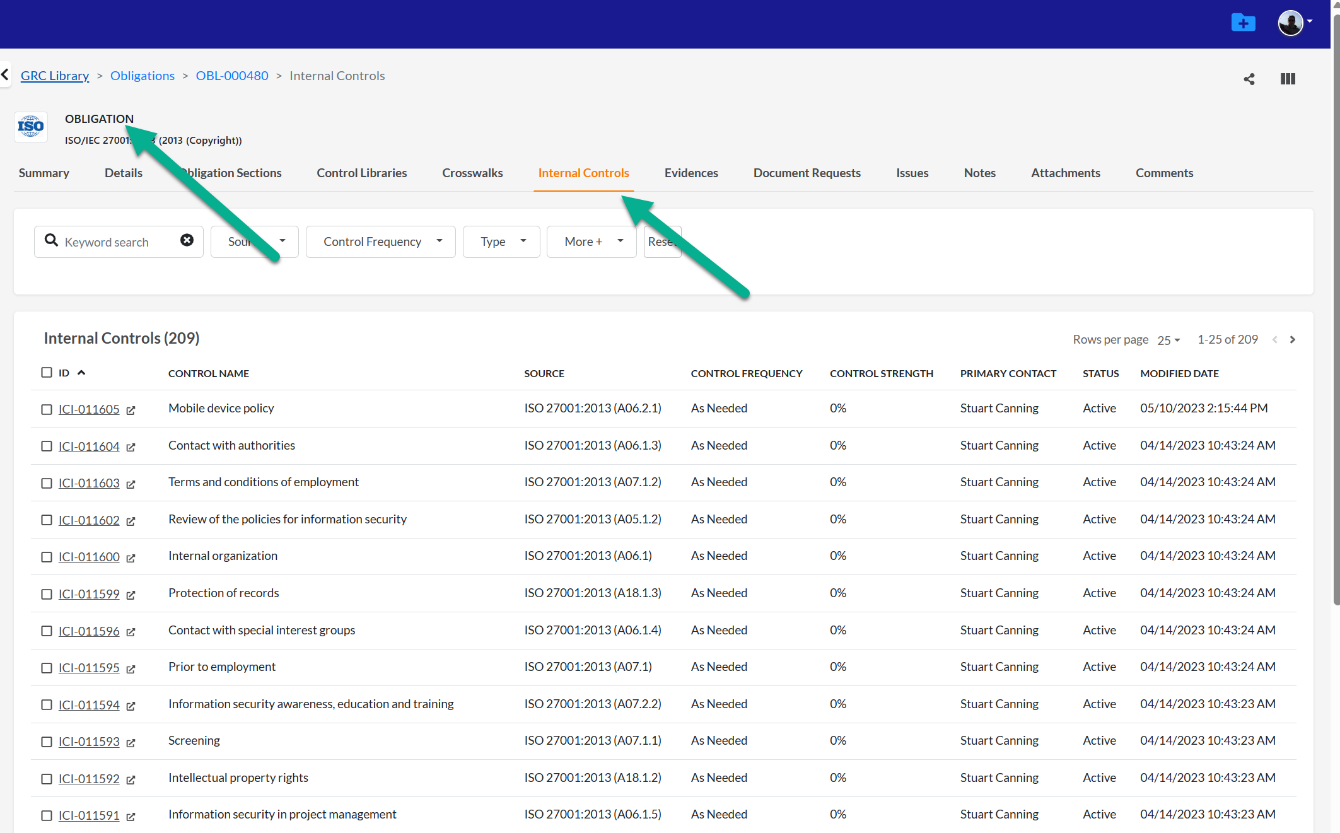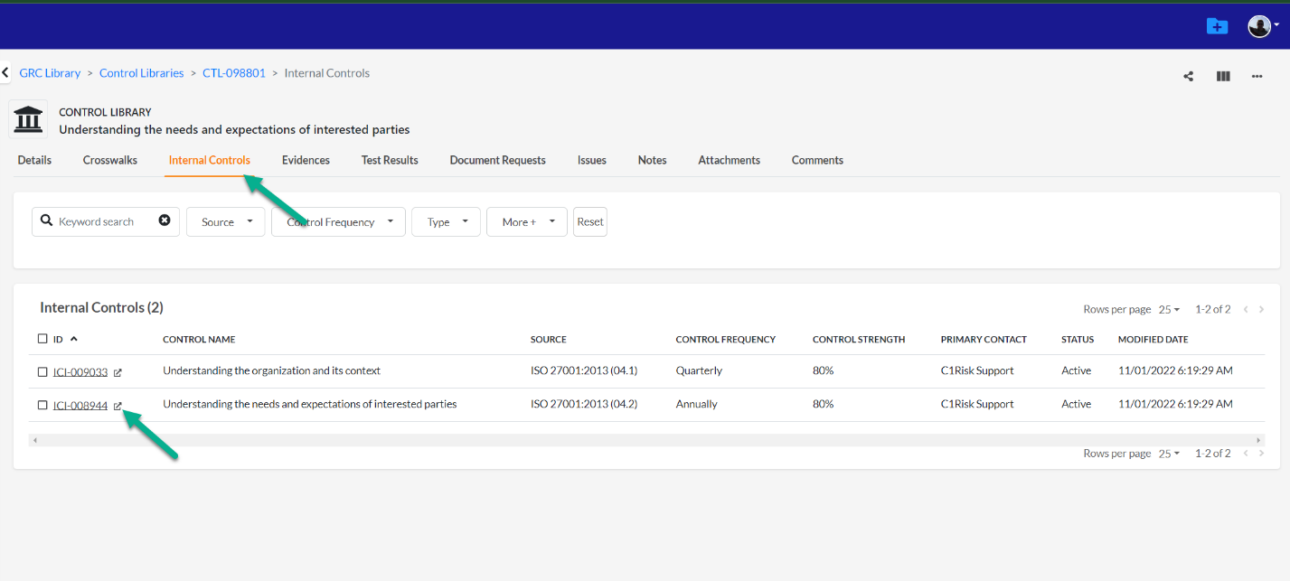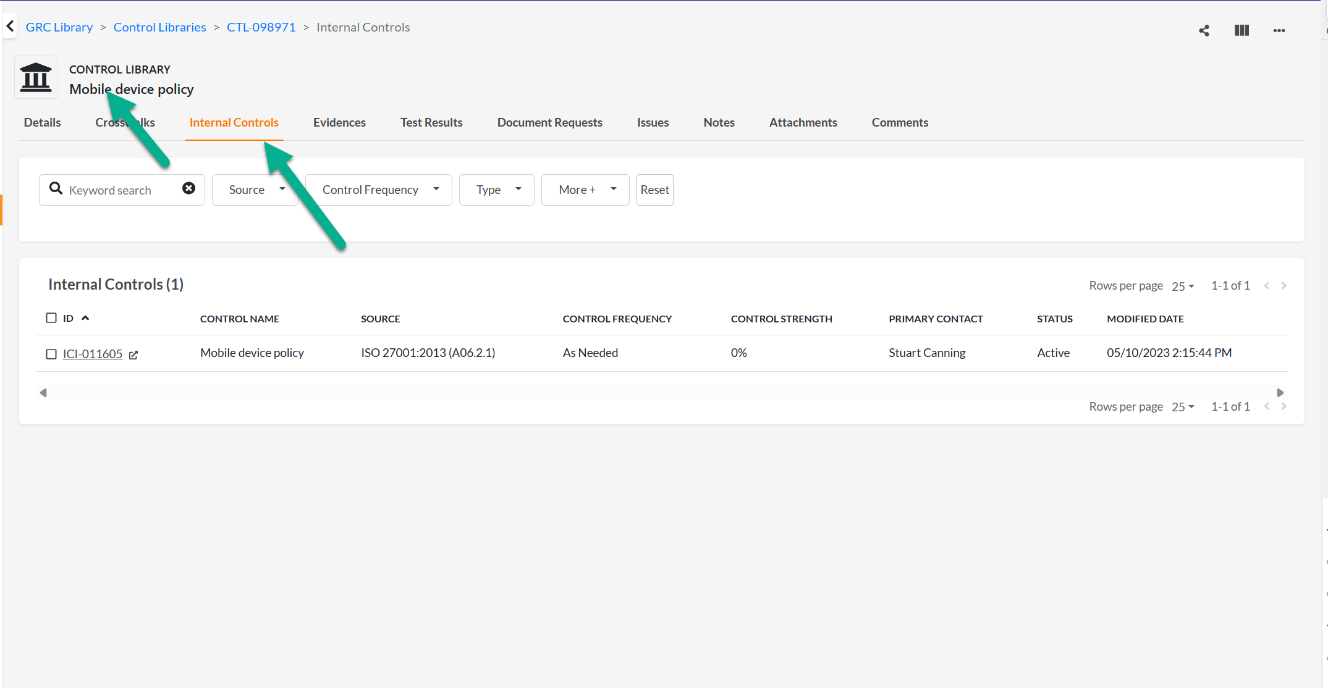 - You can see internal controls > control library mapping from the list view in the Controls Library or Internal Control list view, or, in the individual record.