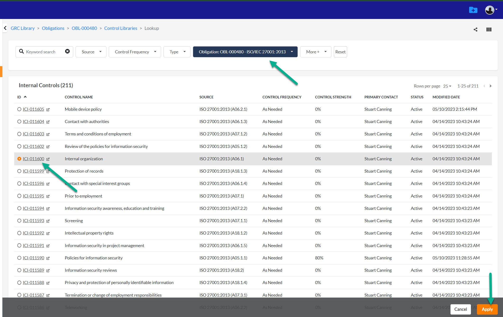 - Select the internal controls you wish to map and click apply. (Note: you can use the filters and key word search in this section to narrow your search)