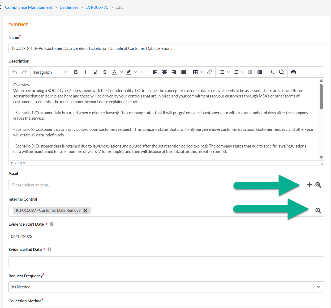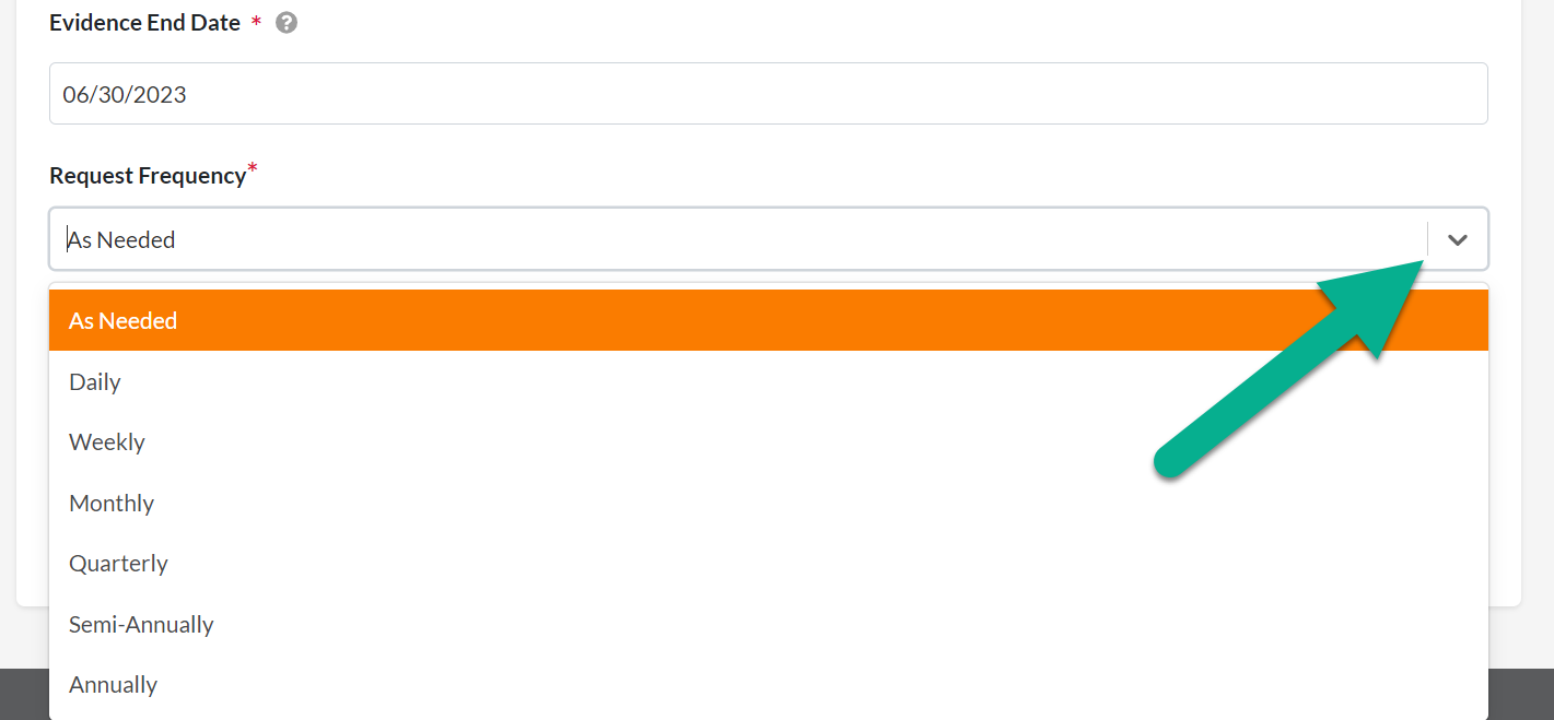 Note: When establishing a frequency for evidence collection, the Start Date and End Date will automatically update based upon the frequency selected.