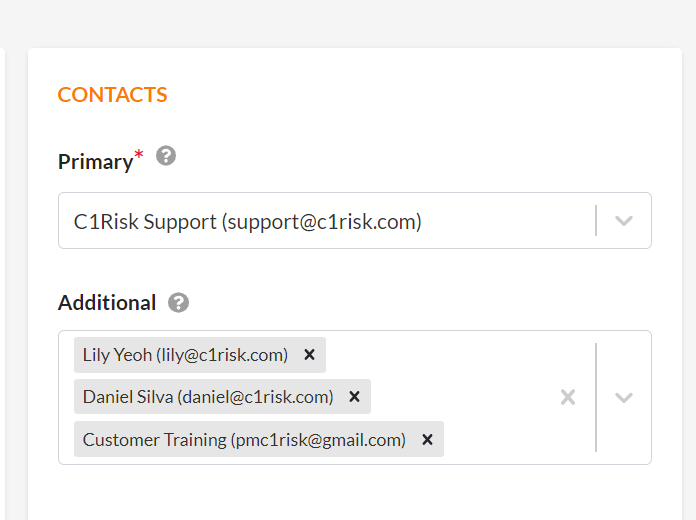 - Primary and Additional Contacts can be Administration or General Users on the platform. To add Users at any time to the platform, contact support, please contact our support team: https://c1risk.freshdesk.com/support/tickets/new