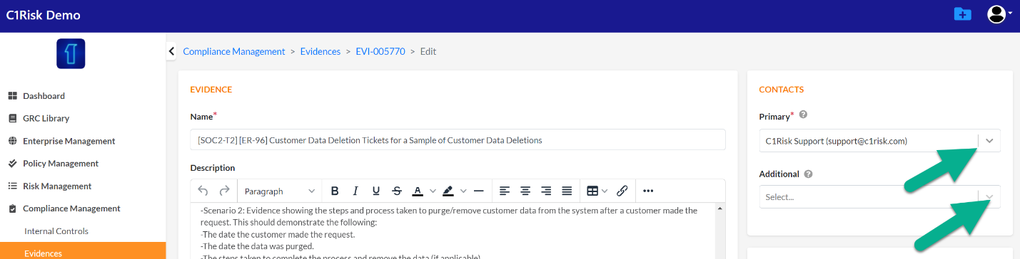 - Note that you can add one a single Primary Contact (typically the person who is responsible for providing the evidence) and multiple additional contacts (team leaders, assistants, stakeholders).