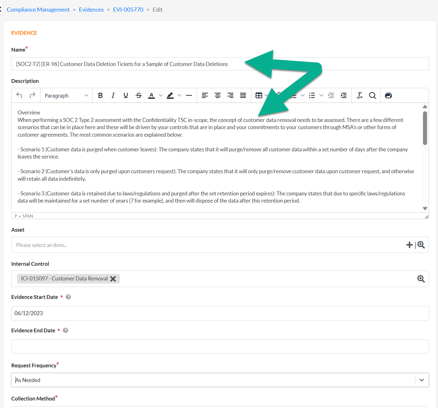 - The End Date ensures that the notification is sent in a timely manner and allows the evidence owner enough time to provide the required evidence, as well as for the compliance team to review and approve the evidence prior to providing it to an external auditor.