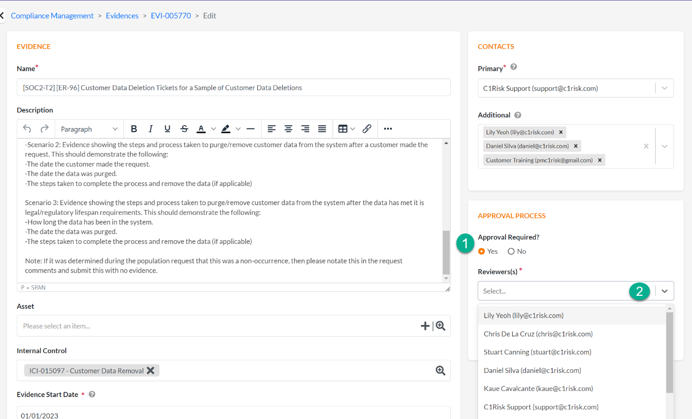 While review is optional in the platform, C1Risk recommends adding review as a step to the process as it enhances the options to collaborate with evidence owners if/when supplemental evidence is needed or there are issues with the information provided.