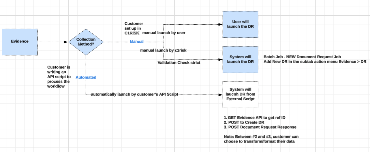Manual collection is used when a user or the C1Risk system initiates the Document Request (DR) directly from the Evidence record.